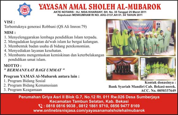 Informasi YayasanYayasan Amal Sholeh Al-Mubarok admin2 tahun ago00 mins Navigasi pos Previous: Wendi Berkah Jaya BanNext: Yayasan Yatim & Dhuafa Al Fatah Tinggalkan Balasan Batalkan balasanAlamat email Anda tidak akan dipublikasikan. Ruas yang wajib ditandai *Komentar * Nama * Email * Situs Web Simpan nama, email, dan situs web saya pada peramban ini untuk komentar saya berikutnya.